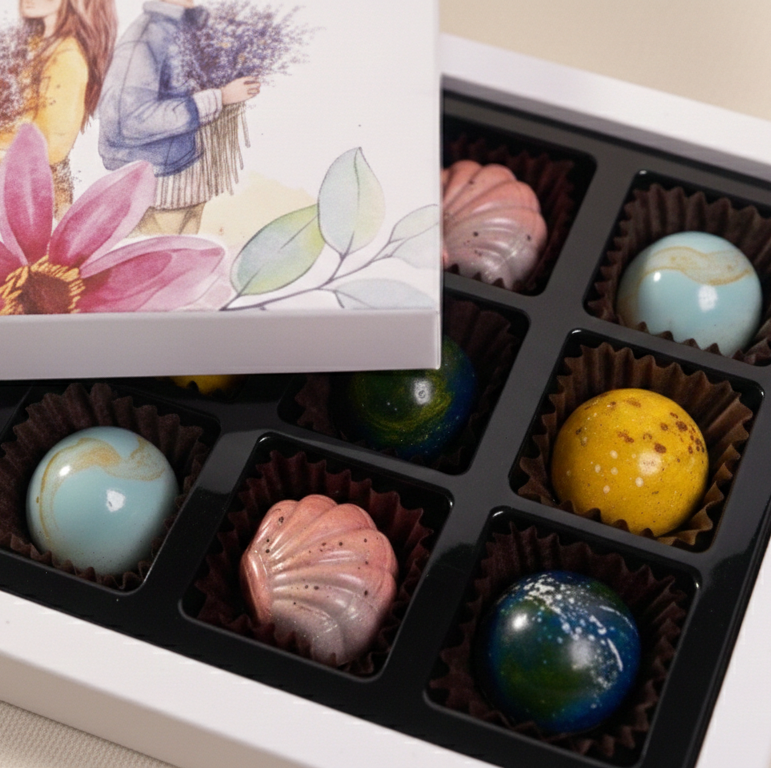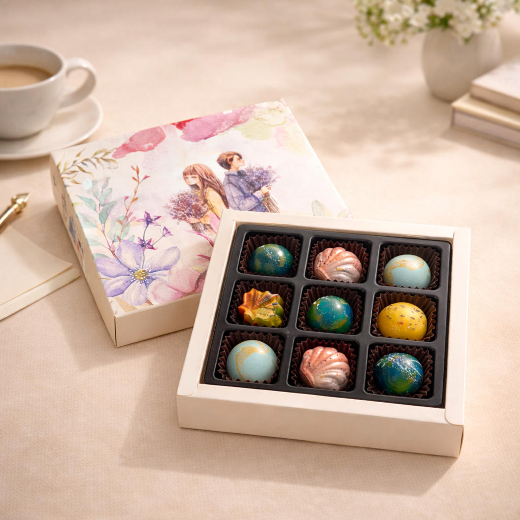 Hộp socola gồm 9 viên socola bonbon màu sắc sinh động như ánh nắng ấm áp xen vào tình yêu 2 người. Mỗi 1 hộp được mix lẫn những viên socola bon bon có nhân: hạnh nhân sấy, hoa quả sấy (xoài, kiwi xanh...)