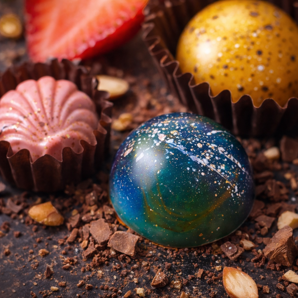 - Thành phần: Socola đen 55%, socola trắng 40%, socola ruby, bơ ca cao, màu thực phẩm, hạnh nhân sấy, hoa quả sấy (xoài, kiwi...)